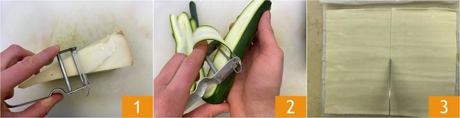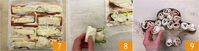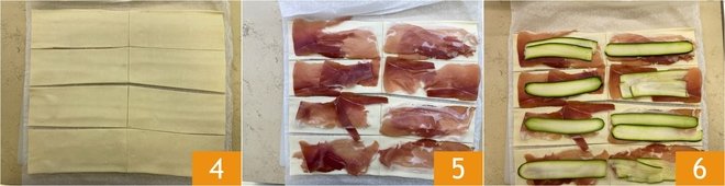 Cut strips about 2 3/8 in wide, so as to obtain a total of 8 rectangles from each sheet 4. Place a slice of speck on each strip 5, then lay a slice of zucchini on top 6.