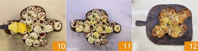 Continue in the same way with the remaining ingredients until the pan is filled. Finally, brush the entire surface with the beaten egg 10, distributing it evenly over all the rolls 11. Bake in a preheated conventional oven at 356 °F for about 40–50 minutes, until you see a nice golden color. Let your savory puff-pastry colomba cool slightly before serving 12!