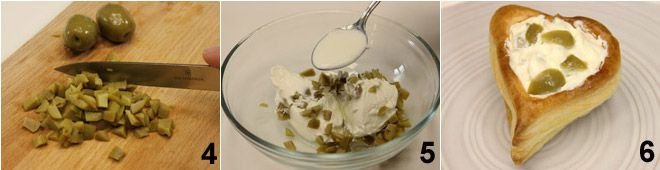 For the olive filling, start by cutting 4 olives into small pieces 4, then mix them with Philadelphia cheese and a teaspoon of cream (or milk) to make it creamy 5. Fill the little hearts with the cheese cream obtained 6 and garnish with the remaining whole olives.