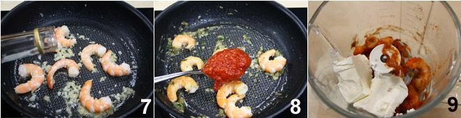 For the shrimp filling, start by sautéing the shrimp with a knob of butter, deglaze with the brandy 7, add the tomato sauce 8 and thyme, and cook. Set aside 4 whole shrimp that you will use for garnish, mix the robiola cheese and blend in a mixer 9 to obtain a smooth cream. Fill the little hearts with the cream and garnish with the whole shrimp. Enjoy your meal!