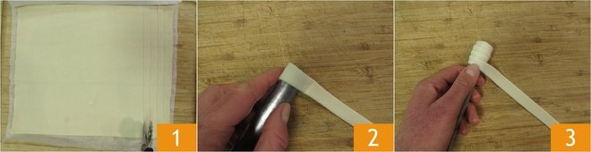 To prepare the savory rolls with goat cheese and bacon, first unroll the puff pastry. Then, using a rolling cutter, cut strips on the longer side, 0.4 inches wide 1, you will get 24 of them. Take one of the strips and fix it to one end of the cannoli molds 2, then start wrapping the pastry around, gently tightening it 3, and when you have finished the pastry, gently pinch the last end. The molds we used are 0.6 inches thick and 6 inches long.