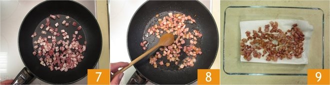 Heat a pan, add the bacon cubes 7, and let them cook for a few minutes, stirring often 8. When they are crispy, drain them and transfer them to a baking dish or a tray with paper towels 9. Set aside for a moment.