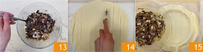 Mix well and set aside for a moment 13. Unroll the puff pastry and cut 8 strips 1/2 inch wide 14. Place the second sheet of puff pastry in a 9-inch pan and pour in the mixture 15.