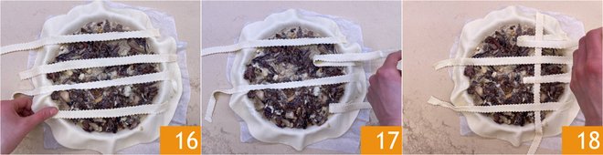 Lay the first 4 strips of puff pastry all in one direction 16, lift the second and fourth 17, and place a strip vertically, then fold them back down 18.