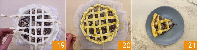 Lift the horizontal strips that you haven't lifted before and place a strip vertically. Continue this way until you complete the strips and create a lattice 19. Fold the edges inward and brush with an egg yolk 20. Bake the savory radicchio and gorgonzola tart in a preheated static oven at 350°F for about 35 minutes. Serve it at the table when it is warm 21.