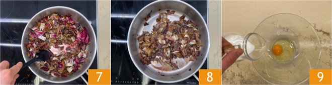Beat the eggs and add the gorgonzola in pieces 10, also add the radicchio 11, salt, pepper, and the walnuts crumbled by hand 12.