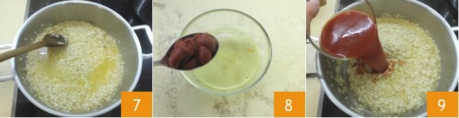 and then add a ladle of vegetable broth (for the best result, follow our guide Vegetable broth), stir 7 and separately dilute a tablespoon of triple tomato concentrate in 50 ml of broth 8 and pour it into the rice 9. Cook the rice, gradually adding vegetable broth and stirring occasionally.
