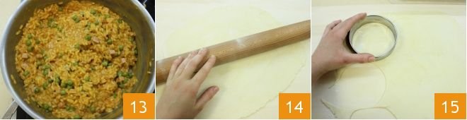 Let the risotto cool 13 and roll out the pastry to about 1/8 inch 14, cut out circles using a pastry cutter with a diameter of about 4.75 inches 15