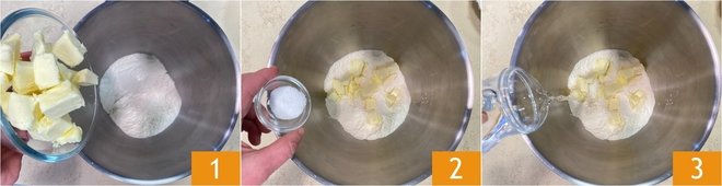 To prepare the savory tart with broad beans and pecorino, first make the pastry: in the bowl of a stand mixer fitted with the paddle attachment add the flour 1, cold butter cut into cubes, the salt 2 and the water 3.