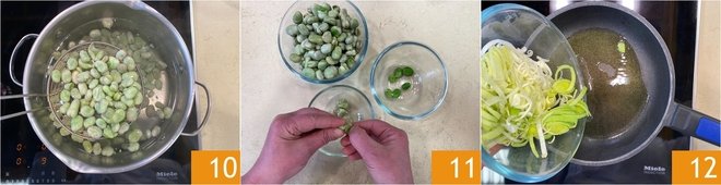 Drain the broad beans 10 and let them cool just enough to remove the outer skin without burning yourself 11. At this point you'll have about 14 oz of broad beans, so transfer about 11 oz to one bowl and about 4 oz to another. In a skillet heat a drizzle of oil and add the leek 12.