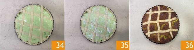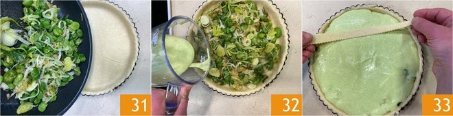 Pour the vegetable mixture 31 and the broad bean and pecorino cream 32 into the pastry shell. Now lay the pastry strips over the surface 33.