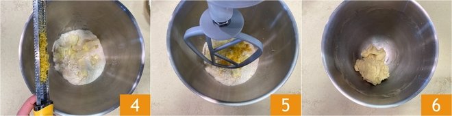 Flavour with the grated zest of the lemon 4 and turn the machine on 5 until you obtain a compact, homogeneous dough 6.