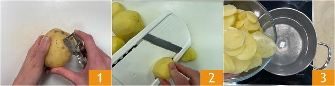 To prepare the savory tart with speck and potatoes, first peel the potatoes 1 and slice them thinly, about half a centimeter thick 2; you can use a mandoline for greater precision. Slice thickness: about 3/16 inch (≈0.2 in). Boil them in hot lightly salted water 3 for about 10 minutes.