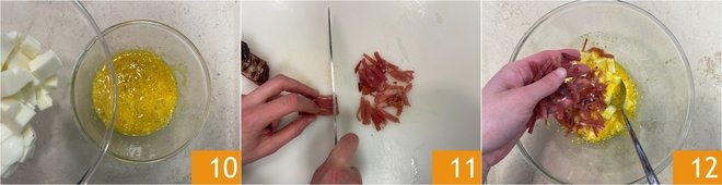 Add the mozzarella cut into cubes 10. Cut the speck into thin strips 11 and add it to the bowl 12.