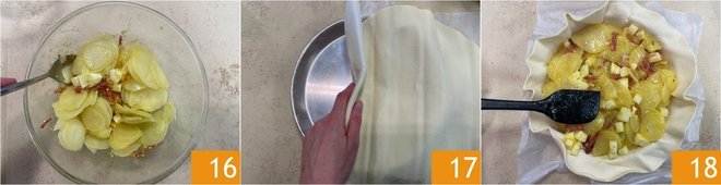Gently mix so as not to break the slices 16. Roll out the puff pastry in a 9.5-inch (24 cm) tart pan, leaving it on its parchment paper 17. Pour the mixture inside and smooth the surface 18.