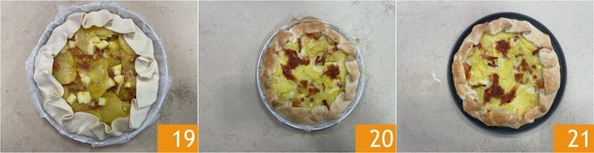Fold the edges of the pastry inward 19 and brush them with a little olive oil, this will give an even browning and a crispier texture. Bake in a conventional oven preheated to 374F for about 40 minutes, until the surface is nicely golden. Once ready, remove from the oven 20 and let it cool for a few minutes before serving your savory tart with speck and potatoes 21: this will make it easier to slice and the filling will be firmer.