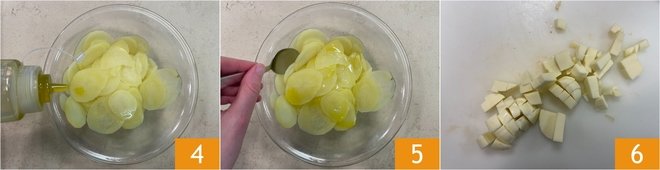 Drain the potatoes, dress them with a drizzle of olive oil 4, toss 5 and let them cool for a few minutes. Meanwhile, cut the mozzarella into cubes 6.