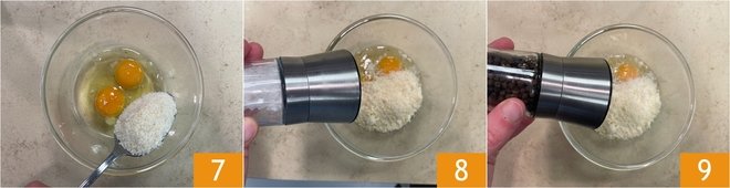 Break the eggs into a bowl, then add grated Parmigiano Reggiano 7, a pinch of salt 8 and a little black pepper 9.