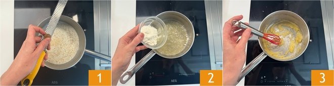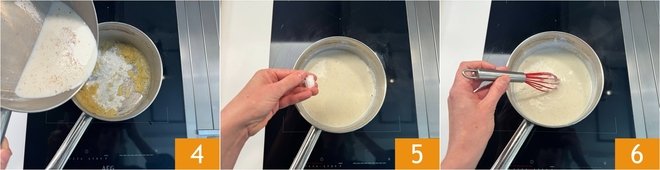To make the savory vegetable tart, start by preparing the bechamel: in a saucepan, heat the milk flavored with nutmeg 1. In another, melt the butter and add the flour all at once 2. Cook while stirring with a whisk to create the roux 3, the thickening base typical of such sauces.
