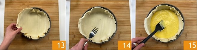 Roll out the puff pastry in a 9-inch diameter buttered springform pan 13, or if you prefer, you can line it with parchment paper. Prick the bottom with a fork 14 and pour the bechamel, cheese, and egg mixture, making sure to distribute it evenly 15.