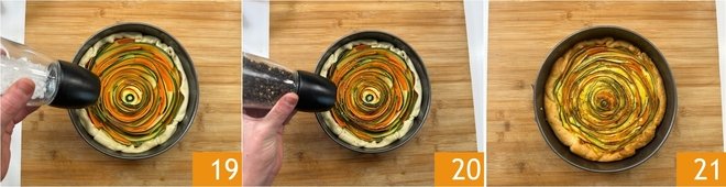Season with salt 19 and pepper 20. Bake in a preheated static oven at 350°F for about 45 minutes. Take out of the oven, let it cool slightly, then remove from the mold and serve your savory vegetable tart 21.