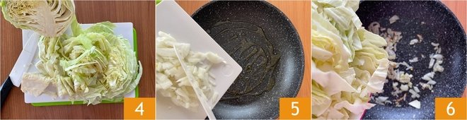 Then cut it into strips, discarding the harder central part. In a fairly large pan, pour the extra virgin olive oil and onion 5. Let it soften over medium heat, then add the savoy cabbage 6.