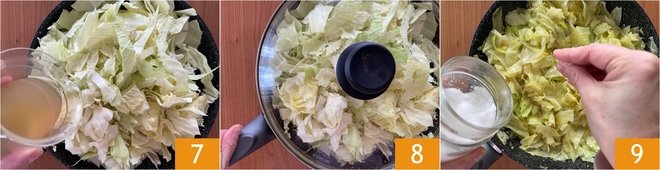 Pour in the hot broth 7, cover with a lid 8, and cook for 10 minutes, stirring several times. Remove the lid, and season with salt 9.