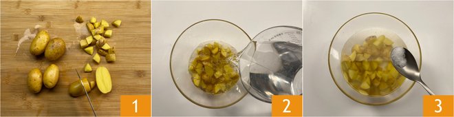 To prepare the savoy cabbage rolls, start by thoroughly washing the potatoes, cut them into chunks no larger than 1 cm (1/2 inch) 1 without peeling them, and immerse them in water 2. Add half a tablespoon of salt 3 and let them sit for 15 minutes.