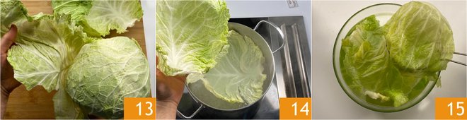 Remove the tougher leaves from the cabbage 13, keep the lighter ones and blanch them in boiling salted water for a couple of minutes 14. Drain them in cold water 15.