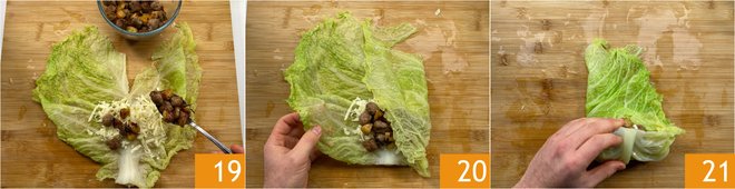 Add about a tablespoon of the sausage and potato filling 19. Fold the sides of the leaf towards the center 20, then roll it up 21.