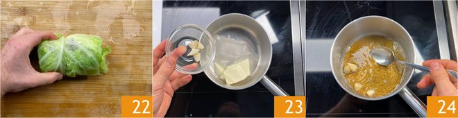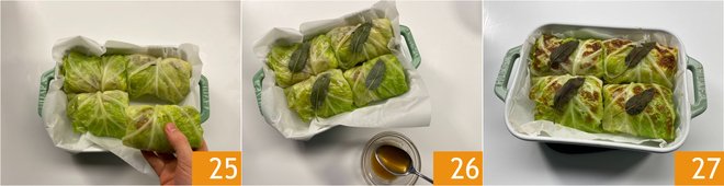 Place the rolls in a baking dish lined with parchment paper 25; top each with a sage leaf and drizzle the surface with the browned butter 26. Bake at 240°F (about 465°F) on the middle-upper shelf for about 10-15 minutes. The savoy cabbage rolls are ready to be enjoyed 27.