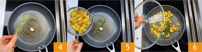 Afterwards, heat a large pan, add a drizzle of oil and season with rosemary and garlic 4. Drain the potatoes and toss them into the hot pan 5. Briefly sauté them, then cover with a lid 6, and let them cook on high heat until the potatoes are golden brown; about 5-10 minutes.