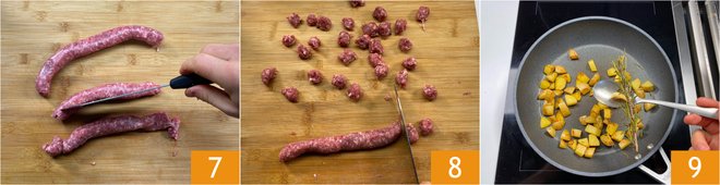 Meanwhile, peel the sausage 7 and cut it into chunks roughly the size of the potatoes 8. Remove the lid and discard the aromatics 9.