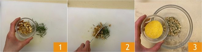 To prepare the scallion rolls, start with the coating: place the walnuts together with the rosemary on a cutting board 1 and finely chop them 2. Pour the mixture into a bowl and add the cornmeal 3.