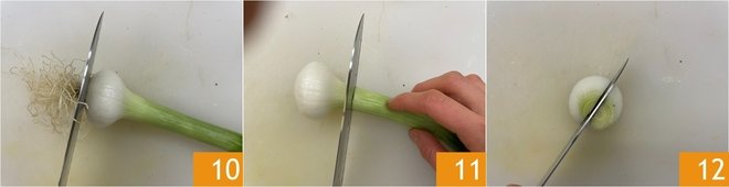 Clean the scallions by removing the tougher outer layer, trim both ends 10 11 and halve them lengthwise 12.