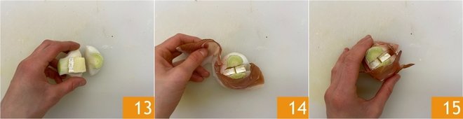 Fill the scallions by placing a piece of brie at the center of one half 13, then close it with the other half to encase the cheese. Wrap each filled scallion with a slice of speck 14, pressing it so it adheres well 15.