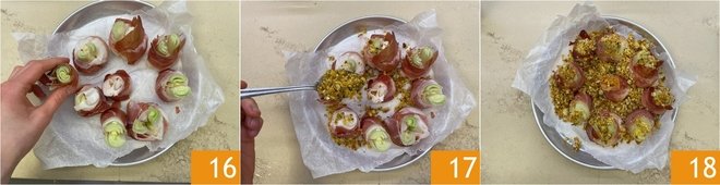 Arrange the rolls on a baking sheet lined with parchment paper 16, slightly spaced apart. Spread the coating over the surface 17 and finish with a drizzle of oil. Bake in a preheated fan-assisted oven at 356°F for 15-20 minutes, until the speck is golden and the coating is crunchy. Remove from the oven 18 and serve the scallion rolls hot so you can fully enjoy the soft, melty brie center.