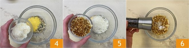 Add the grated Parmesan 4 and coarse breadcrumbs 5; then season with salt and pepper to taste 6.