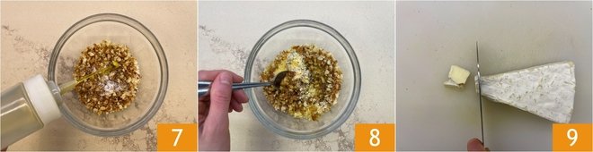 Add a drizzle of extra virgin olive oil 7 and mix until you obtain a sandy mixture 8. Then cut the brie into pieces 9.