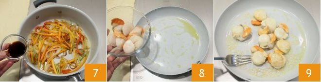 Finally, add the soy sauce 7, let it evaporate, and turn off the heat. In another pan, pour a drizzle of oil and sear the scallops removed from their shells 8. Brown them for 3-4 minutes over high heat, turning them with a fork 9.