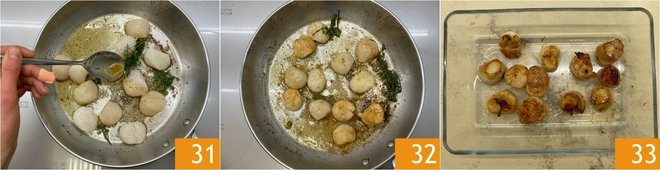 Continue cooking by basting the scallops with the melted butter, which will gather the flavor of the herbs and the cooking juices 31. Cook the scallops only on one side, and when they are well colored 32, remove them from the pan 33.