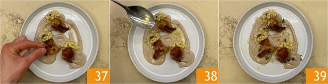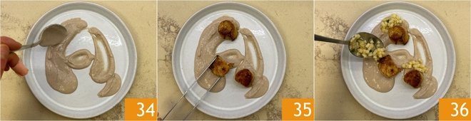 You are ready to plate: spread the chestnut cream on the base of the plate 34, then place the scallops on top 35 and the apple cubes 36.
