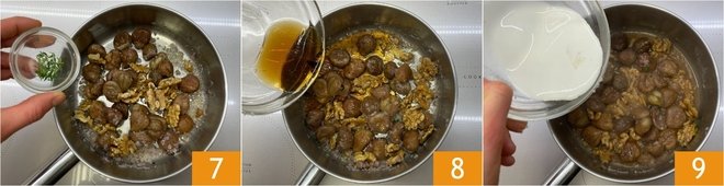 When the shallot has wilted, add the chestnuts (previously boiled or you can use pre-cooked chestnuts) 4, and the walnuts 5. Salt and pepper 6.