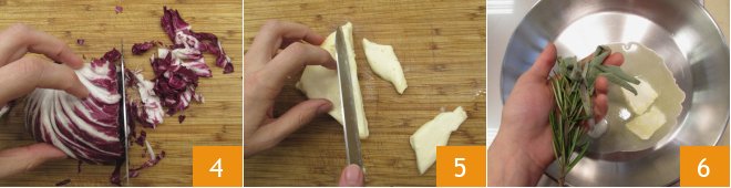 Wash and clean the radicchio, then cut it into strips 4. Slice the taleggio as well 5. In a saucepan, melt the butter with the oil and aromatic herbs, letting it flavor for a couple of minutes 6.