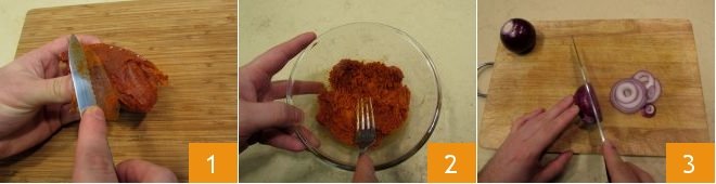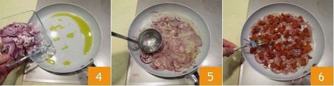 To prepare the scialatielli with nduja, remove the casing from the nduja 1 and place it in a bowl, mashing it with a fork to soften it 2. Slice the onion 3