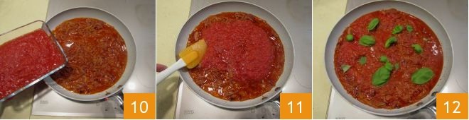 Add the tomato pulp 10 and let cook over moderate heat for 15 minutes 11, then finish by adding a few basil leaves 12.