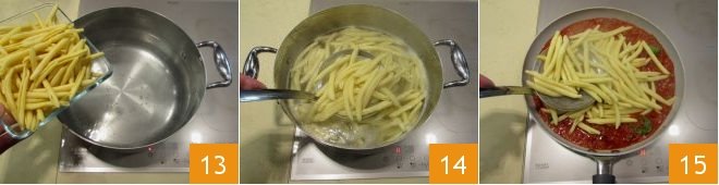 Put a pot with plenty of salted water on the heat and bring it to a simmer. Cook the scialatielli for 11 minutes 13, leaving them al dente, then drain them 14, add them directly to the sauce you have prepared 15, and mix to flavor them.