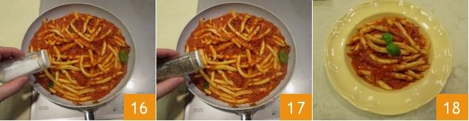 Sauté everything for a few moments and adjust the salt 16 and pepper 17, then serve your scialatielli with nduja piping hot 18.