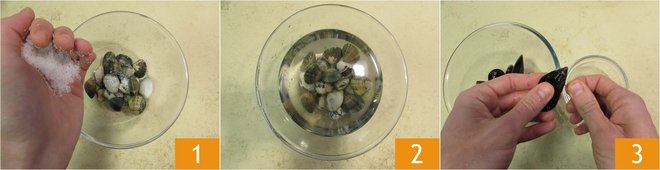 To prepare scialatielli with seafood, first wash the clams, then place them in a bowl and add about 1 tablespoon of salt 1. Cover them with water 2 and let them purge for an hour. Then also clean the mussels 3.