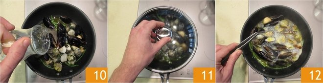 If necessary, add a little water to facilitate opening 10 and cover with a lid 11. Place a strainer over a bowl and as the mussels and clams open, remove them with tongs 12